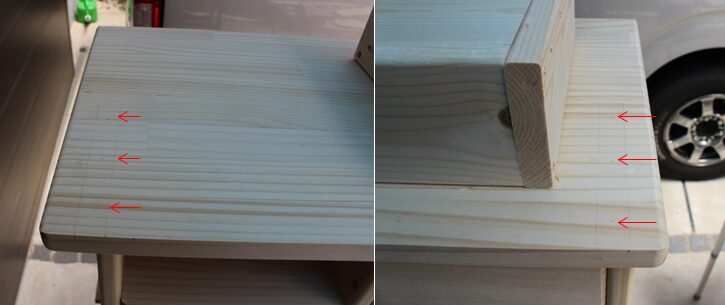 天板にF、Gパーツを取り付けるために天板裏にダボ穴加工するためのマーキングを行います。マーキング位置は丁度I、Hパーツの真上あたりになりますので、天板の端から約3.5cmの位置に3箇所マーキングしましょう。