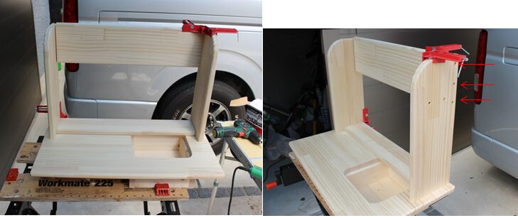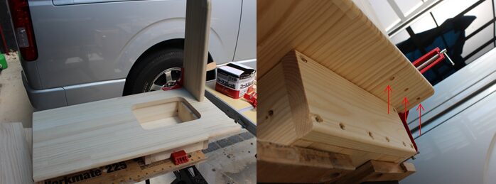 天板への固定パーツは先ず最初にGパーツを取り付けます。Gパーツは天板の裏側から3箇所をビスで固定するため、事前にマーキングした部分にダボ穴を加工し、ビスで固定します。ビスで固定する際は予め、Lクランプで直角に固定してから作業します。