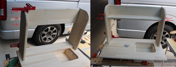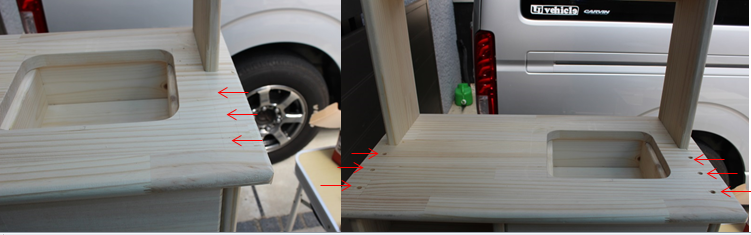 左写真の3箇所でPとFパーツを接合します。その後、EパーツをP、Fパーツの両サイドからビス2箇所づつで固定します。最後にFパーツを天板の裏側から3箇所、天板に固定します。