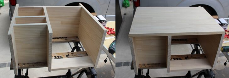 P、F、Eパーツを固定した天板を本体に固定します。固定場所は天板両サイドの6箇所をビスで固定します。この時に、裏側の背板と天板がツライチに揃っているか、位置を確認してからビスを打ち込みましょう。