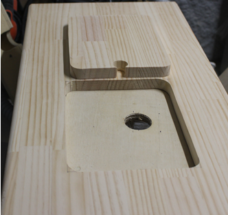 シンクを加工した後に残った板は、まな板になります。まな板の寸法は大凡180×200mmになります。まな板の右端には直系30mm程度のホールを加工して、まな板を天板から取り外ししやすくします。