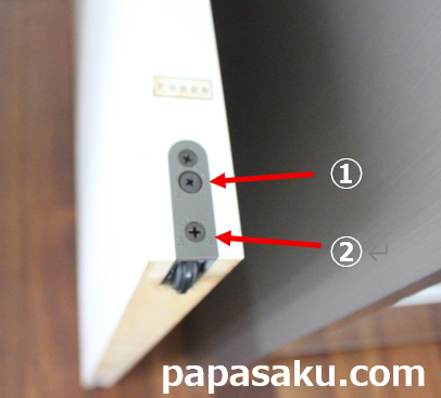 引き戸の上下方向の調整:上図の①のネジの回転で調整します。時計回りにに回転させると上方向に、反時計回りに回転させると下方向に移動します。最大で3mm程度動きますよ。