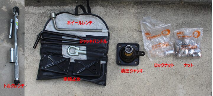 車載工具としてはホイールレンチ、ジャッキハンドル、車輪止め、油圧ジャッキがありまして、これらの工具がありますと、交換作業は可能です。