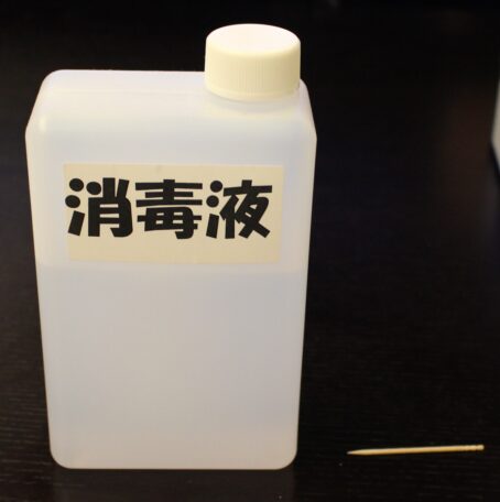- 消毒用エタノールをティッシュペーパーに染み込ませ、ケース全体と本体全体を清拭します。